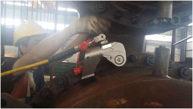 聚頂機械針對化工廠裝備公司的情況,派遣了有現場經驗的技術員前往查看,現場工況相對不是很復雜,標配的液壓扳手就能解決,但也存在較為特殊的情況,如法蘭連接處不是平面,夾角不是垂直或者工作空間狹小等情況,聚頂機械公司從用戶的角度出發,給出的解決方案不光滿足工作要求,還要為客戶節約成本,所以針對化工廠裝備公司常規以及特殊的現場情況聚頂機械公司采用一套液壓扳手就能解決全部問題的方案,得到客戶的高度認可。由于現場工人不會使用液壓扳手,聚頂機械技術人員就手把手教操作人員,直到都能熟練操作為止,同時在現場工人的要求下,用液壓扳手裝配一套壓力容器,最后還要加水打壓檢測是否泄漏,一切都超出了工人們的預料,大家都說以后有了液壓扳手他們心里有底多了,以后就不再全部依賴“風炮”了,技術主管人員也說使用液壓扳手后交付給客戶的產品,他們就放心了。